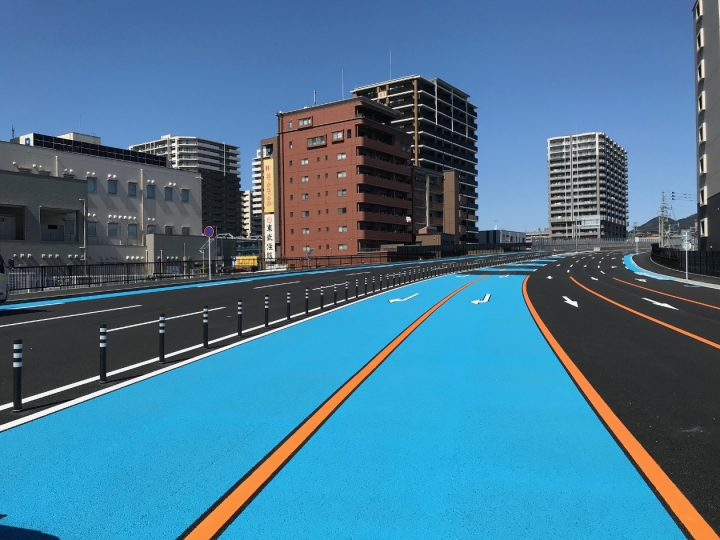 ●作品タイトル:「空も道路も水色」 ●撮影場所 :福岡3号松崎地区舗装工事
