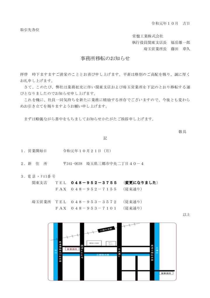 この度、弊社は業務拡充に伴い関東支店および埼玉営業所を下記の通り移転する運びとなりました。 営業開始日 令和元年10月21日(月) 新 住 所 〒341-0038 埼玉県三郷市中央二丁目40-4 電話・FAX番号 関東支店 TEL 048-952-3755 (変更になりました) FAX 048-952-7155 (従来通り) 埼玉営業所 TEL 048-953-3572 (従来通り) FAX 048-953-7101 (従来通り) これを機に、社員一同気持ちを新たに業務に精励する所存でございますので、今後とも変わらぬお引き立てを賜りますようお願い申し上げます。