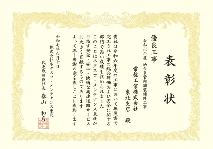 表彰者:㈱ネクスコ・メンテナンス東北 受賞者:東北支店 工事名:令和6年度 仙台東管内舗装補修工事 現場代理人/監理技術者:五十嵐 努 表彰内容:安全表彰