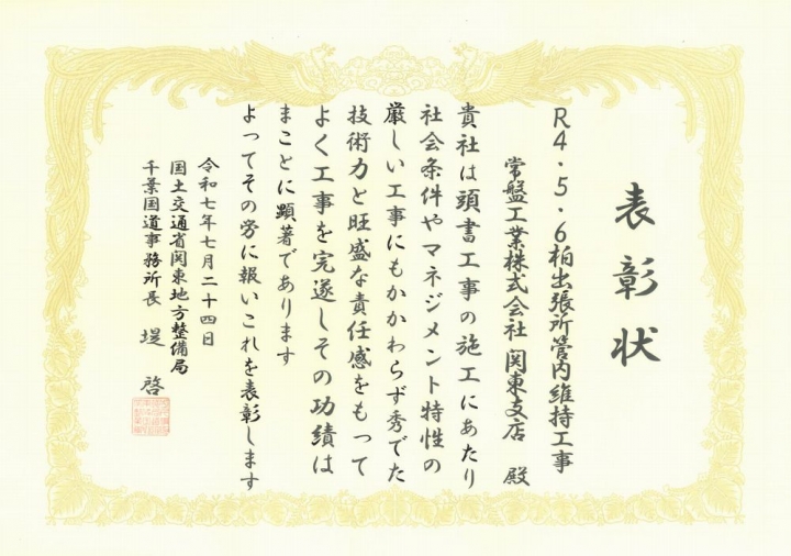 表彰者 :国土交通省関東地方整備局千葉国道事務所 受賞者 :関東支店 表彰内容:難工事功労表彰 工事名 :R4・5・6柏出張所管内維持工事 現場代理人:渡部 理 監理技術者:横山 隆浩
