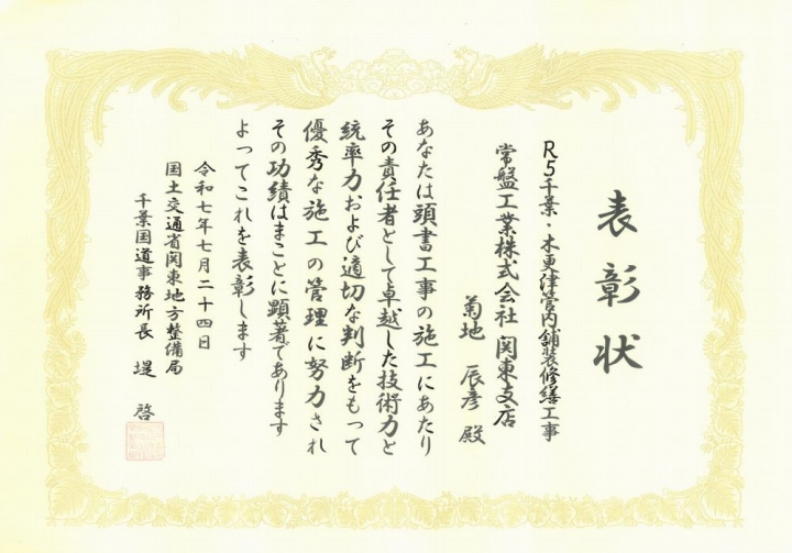 表彰者 :国土交通省関東地方整備局千葉国道事務所 受賞者 :菊地 辰彦(監理技術者) 表彰内容:優秀工事技術者 工事名 :R5千葉・木更津管内舗装修繕工事