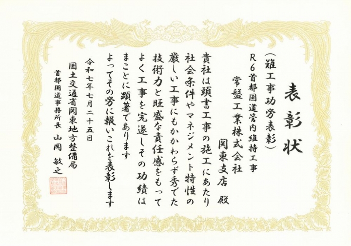 表彰者 :国土交通省関東地方整備局首都国道事務所 受賞者 :関東支店 表彰内容:難工事功労表彰 工事名 :R6首都国道管内維持工事 現場代理人:若林 佳祐 監理技術者:野村 航士郎