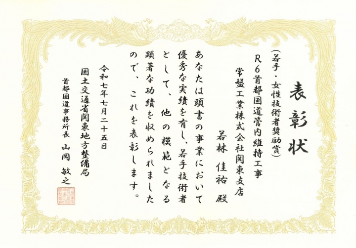 表彰者 :国土交通省関東地方整備局首都国道事務所 受賞者 :若林 佳祐 表彰内容:若手技術者奨励賞 工事名 :R6首都国道管内維持工事