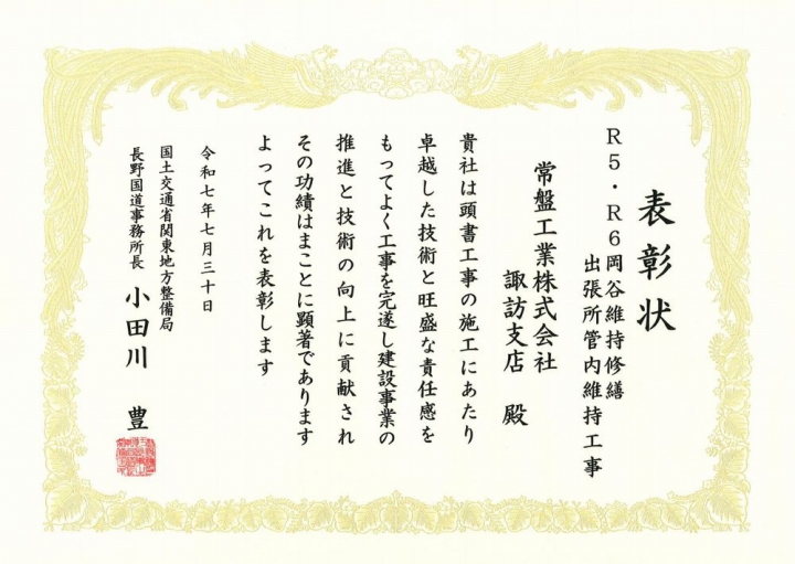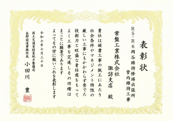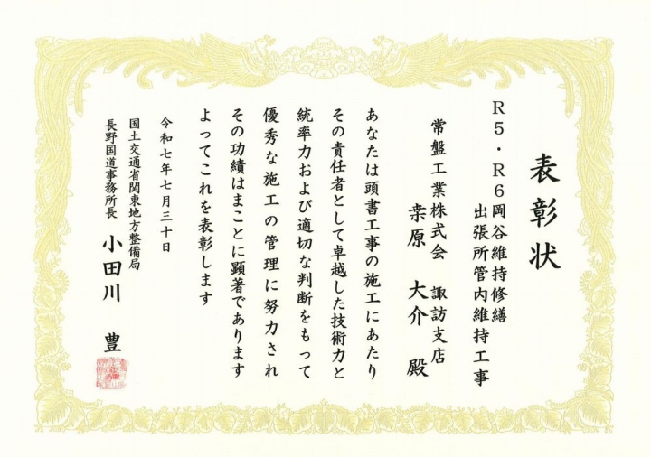 表彰者 :国土交通省関東地方整備局長野国道事務所 受賞者 :諏訪支店 表彰内容:難工事表彰 工事名 :R5・R6岡谷維持修繕出張所管内維持工事 現場代理人:桒原 大介 監理技術者:田中 愼一郎
