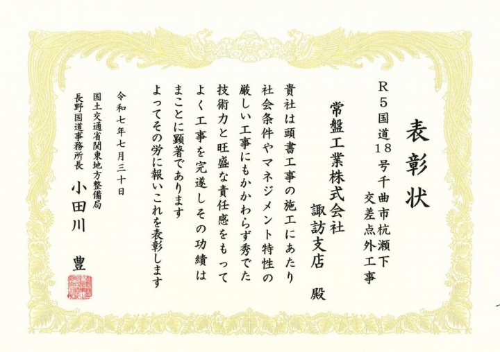 表彰者 :国土交通省関東地方整備局長野国道事務所 受賞者 :諏訪支店 表彰内容:難工事表彰 工事名 :R5国道18号千曲市杭瀬下交差点外工事 現場代理人:小池 成三 監理技術者:岡田 圭二