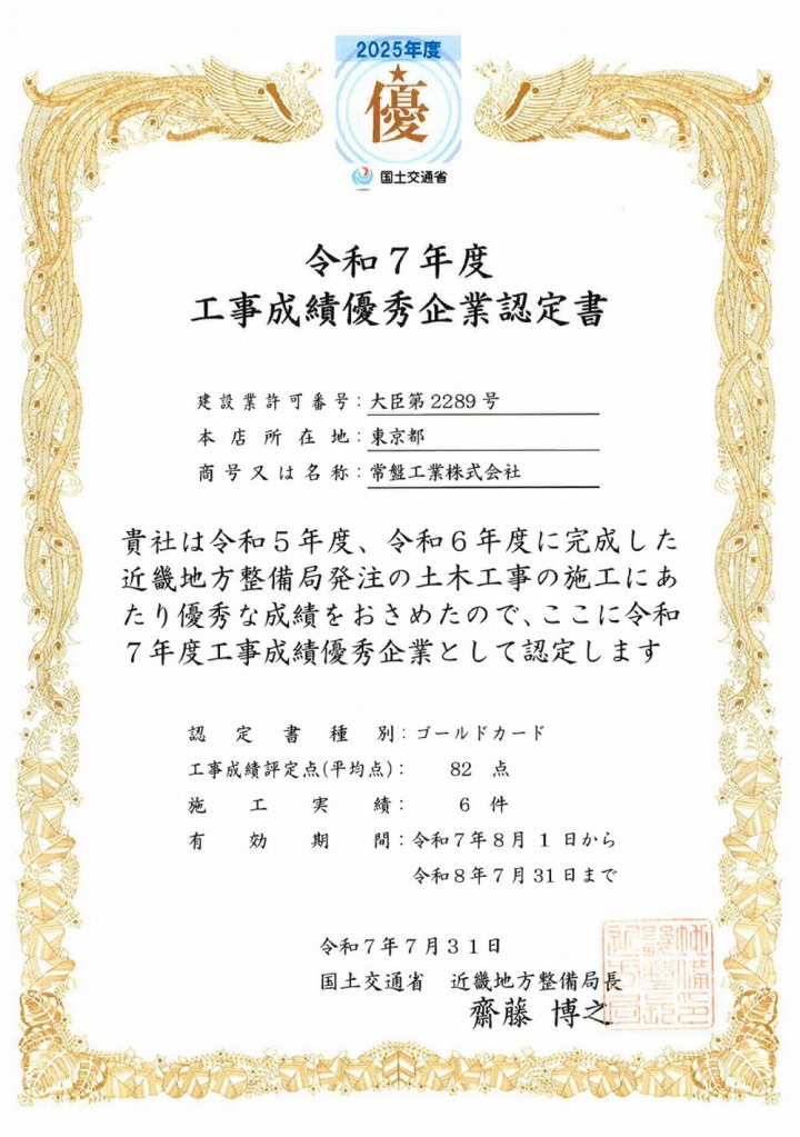 表彰者 :国土交通省近畿地方整備局 受賞者 :大阪支店・北陸支店 表彰内容:令和7年度 工事成績優秀企業認定書