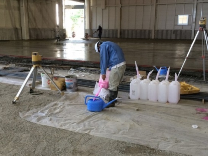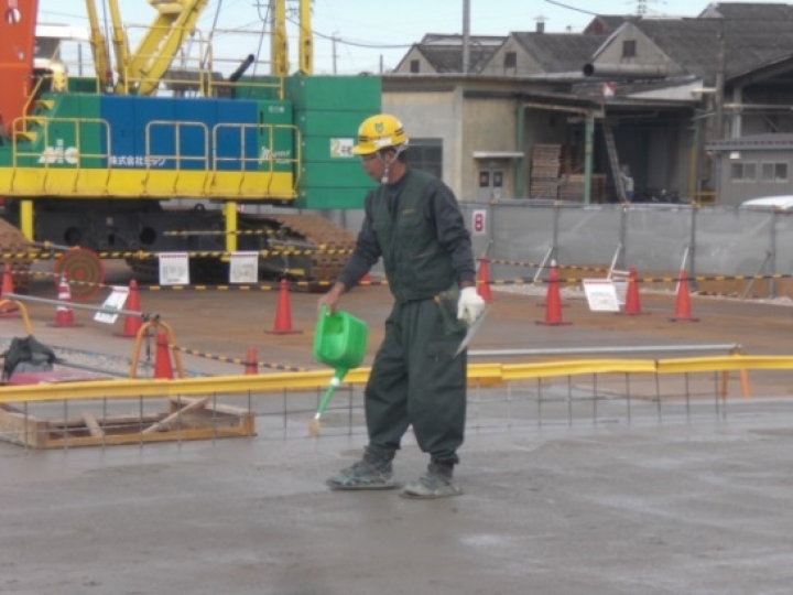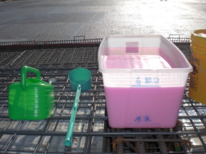 コンクリート打設均し直後に低圧噴霧器またはじょうろ等で散布します。