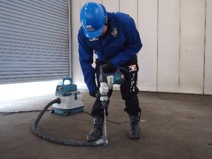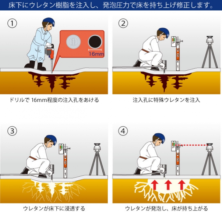 アップコン工法は、沈下・傾きが生じた既設コンクリート床に、1円玉程度(16mm)の小さな孔を開け、レベルを常時監視しながら特殊な発砲ウレタン樹脂を注入します。