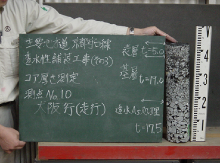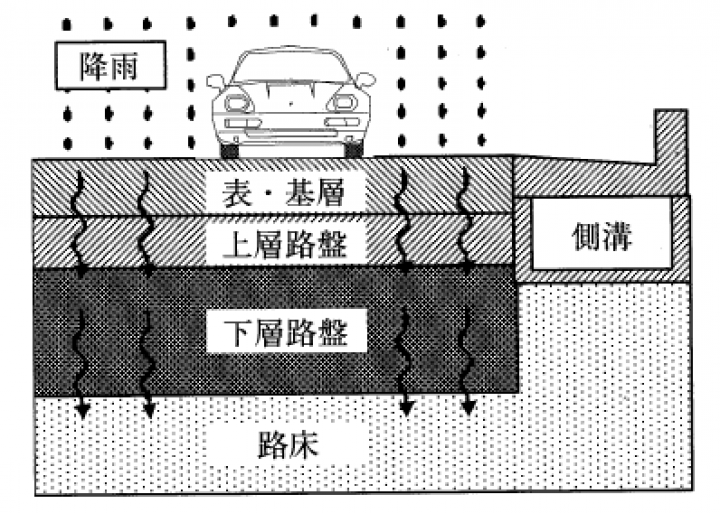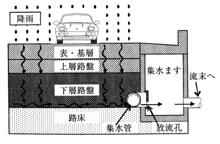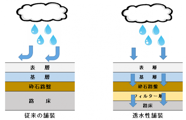 透水性舗装は、雨水を表層から基層、路盤を通して路床に浸透させる構造の舗装です。