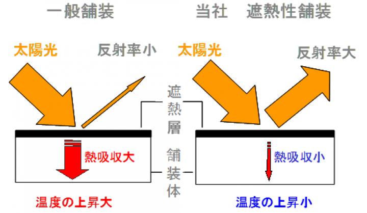 遮熱性舗装は、日射エネルギー量の約半分を占める近赤外線を高反射して、舗装路面の温度上昇を抑制する舗装です。