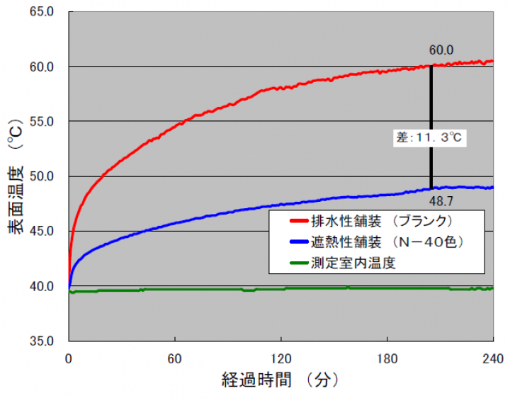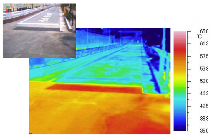 また、排水性舗装などに適用した場合には、舗装が有する透水機能や騒音低減効果と、路面温度の上昇抑制機能が両立する舗装となります。さらに、一般の 舗装よりも表面温度の上昇を抑制できるため、歩行者空間や沿道の熱環境の改善、ヒートアイランド現象の緩和が期待されます。