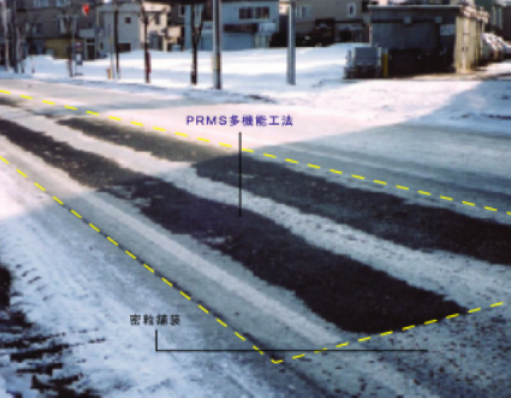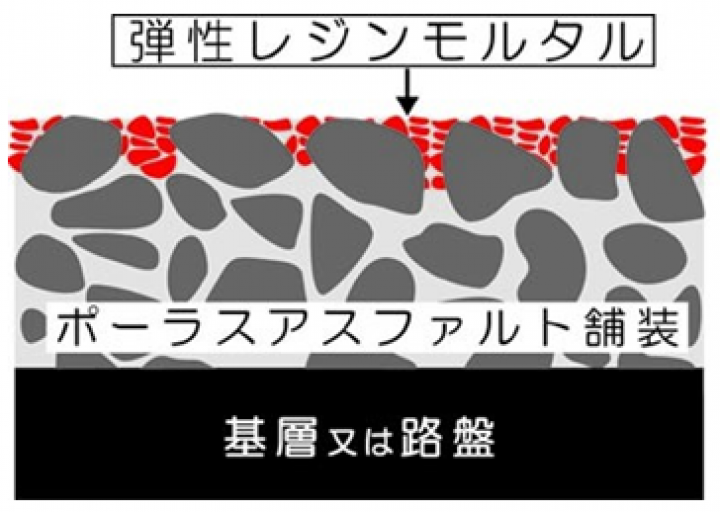 透水性レジンモルタルシステム多機能工法「PRMS多機能工法」は、排水性舗装の空隙部分に弾性レジンモルタルを充填する工法です。特殊ゴムチップ(弾性骨材)を充填することにより、騒音低減効果が向上するとともに、凍結抑制効果が付加されます。