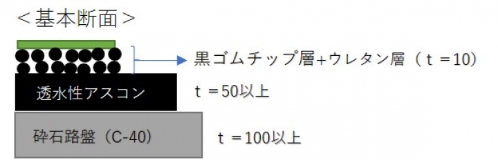 ゴムチップ層とウレタン層、カラートップコートからなるソフトタイプ(非透水)