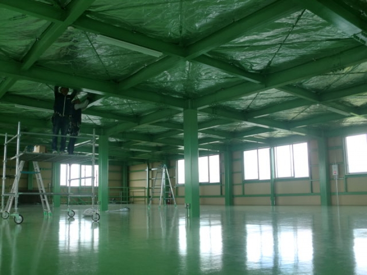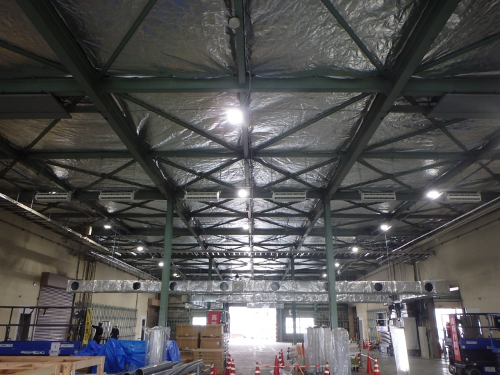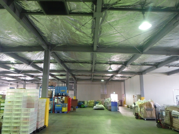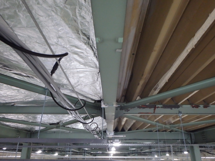 キープサーモウォールは建物内が暑くなる最大の要因″輻射熱″を97%カットする高性能遮熱フィルムです。倉庫・工場等の天井面に使用することで輻射熱を反射し、建物内の温度上昇を抑制します。鉄骨に金具で取付固定するシンプルな工法です。