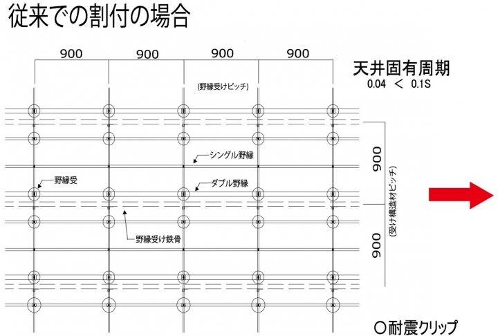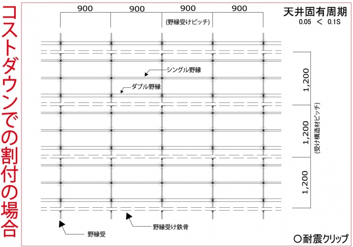 3.受け構造材ピッチは1200mmで、天井固有周期が0.05となります。