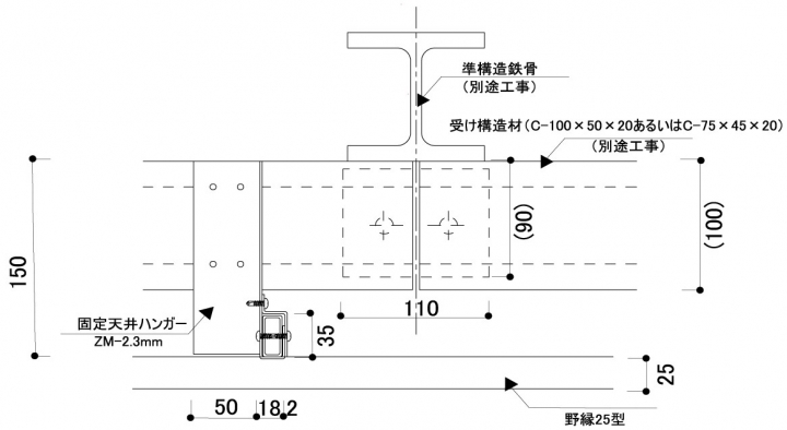 1.準構造仕様は、野縁受けとして角パイプ(32×14×1.6)を使用しています。